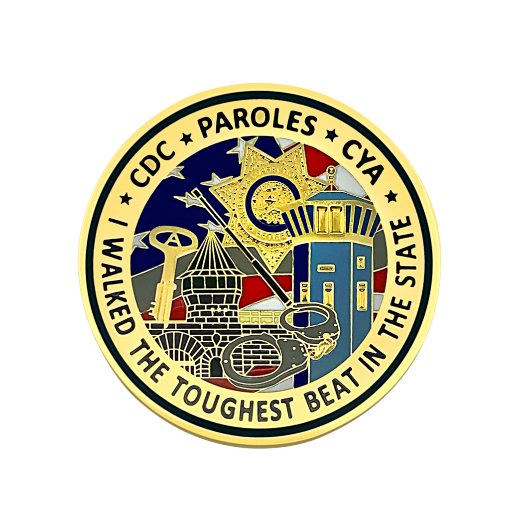 The CDC RETIRED CORRECTIONAL GUARD CHALLENGE COIN highlights images of the California Department of Corrections.